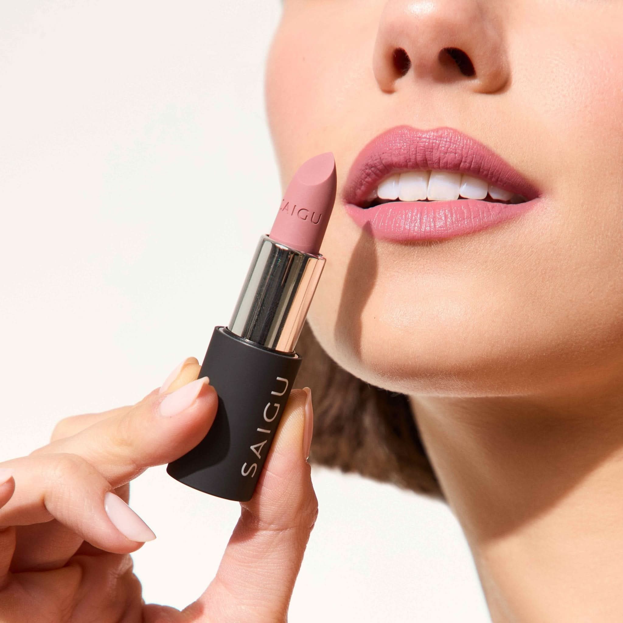 Paz: Marrón rosado de subtono neutro. Aunque en la imagen puedas verlo más oscuro, en el labio se transforma en un “nude” clásico que no borra el color natural, sino que lo realza ligeramente.