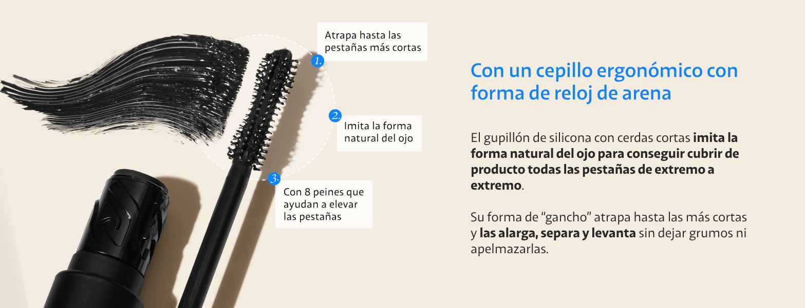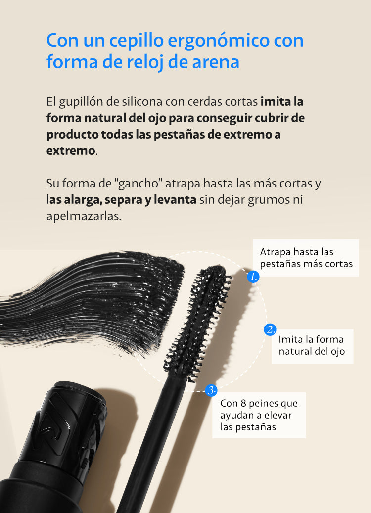 Es una máscara de pestañas pensada para alargar, definir y curvar las pestañas. El cepillo es diferente, este tiene forma de reloj de arena para atrapar las pestañas más cortas y repartir el producto de extremo a extremo.