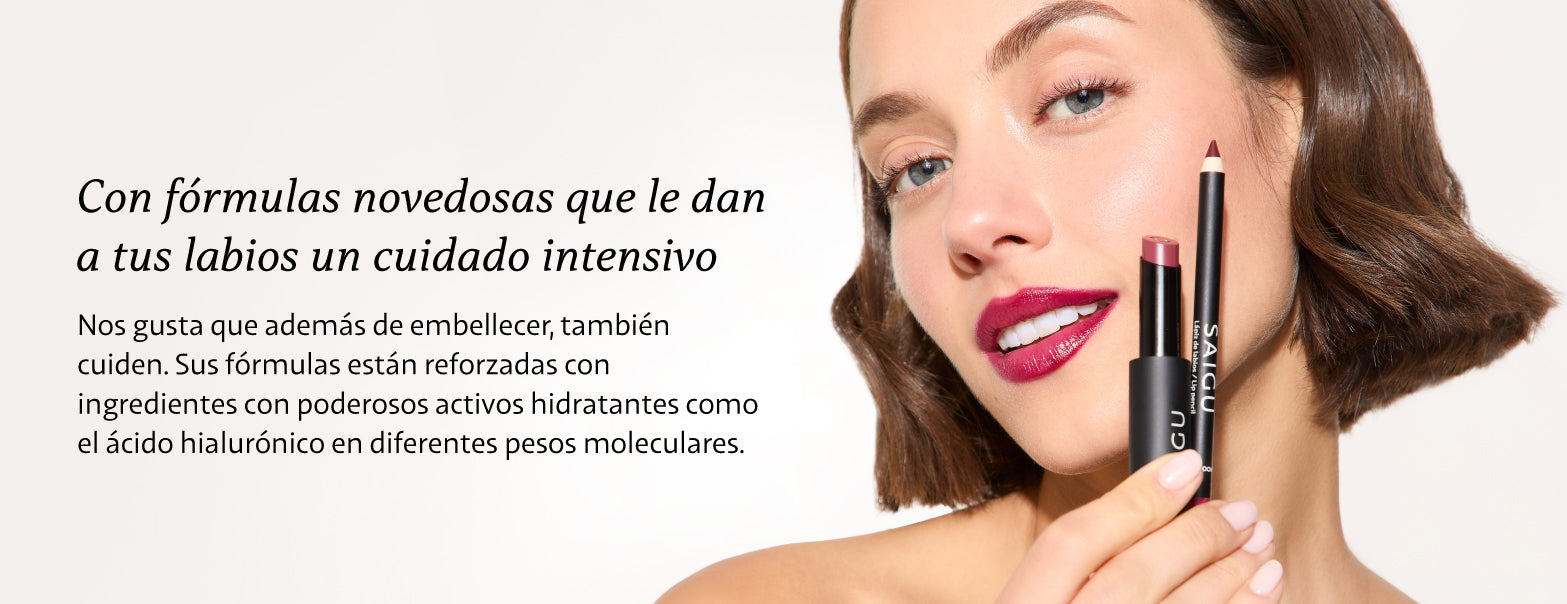 Este pack incluye: Pintalabios Velvet con ácido hialurónico + Pintalabios Melting Glow + Lápiz de labios Perfilado Sedoso