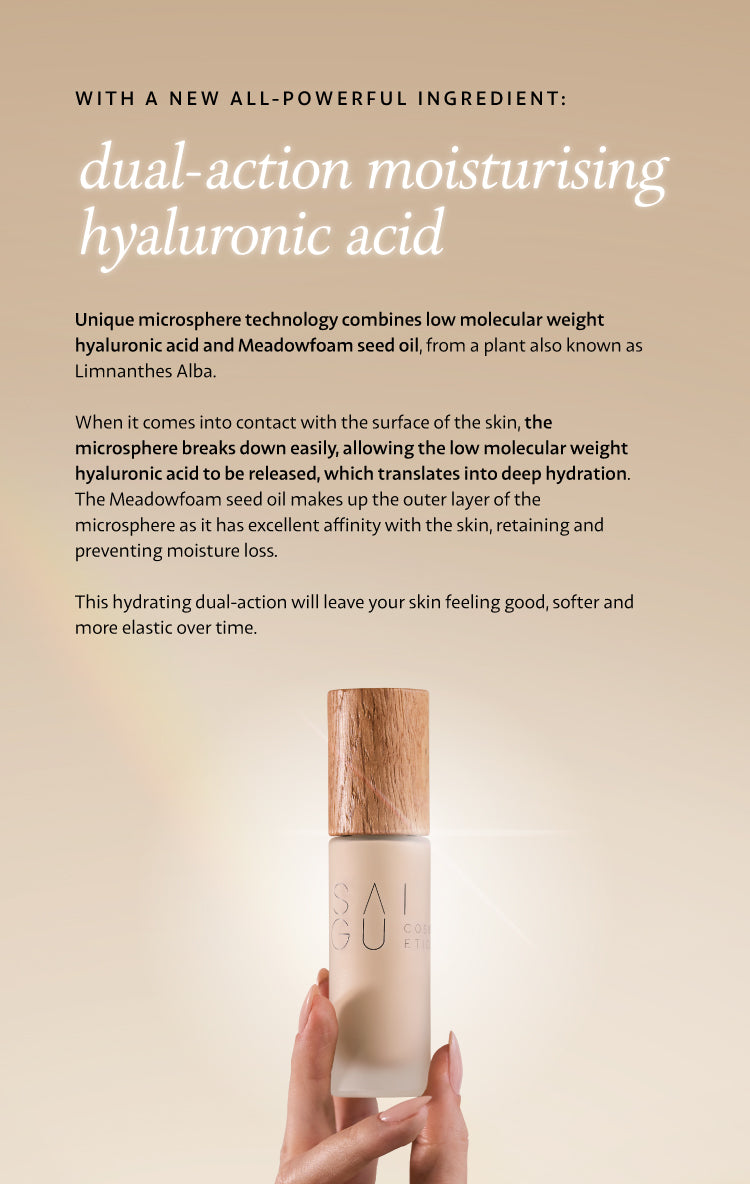 There’s nothing more important than feeling good in your skin. That’s why this liquid foundation is light and a joy to wear, covering up any small imperfections and leaving your skin feeling fresh and healthy. Its new and improved formula with dual-action hyaluronic acid means you can enjoy that gloriously supple feeling all day long. Your skin, at its very best.