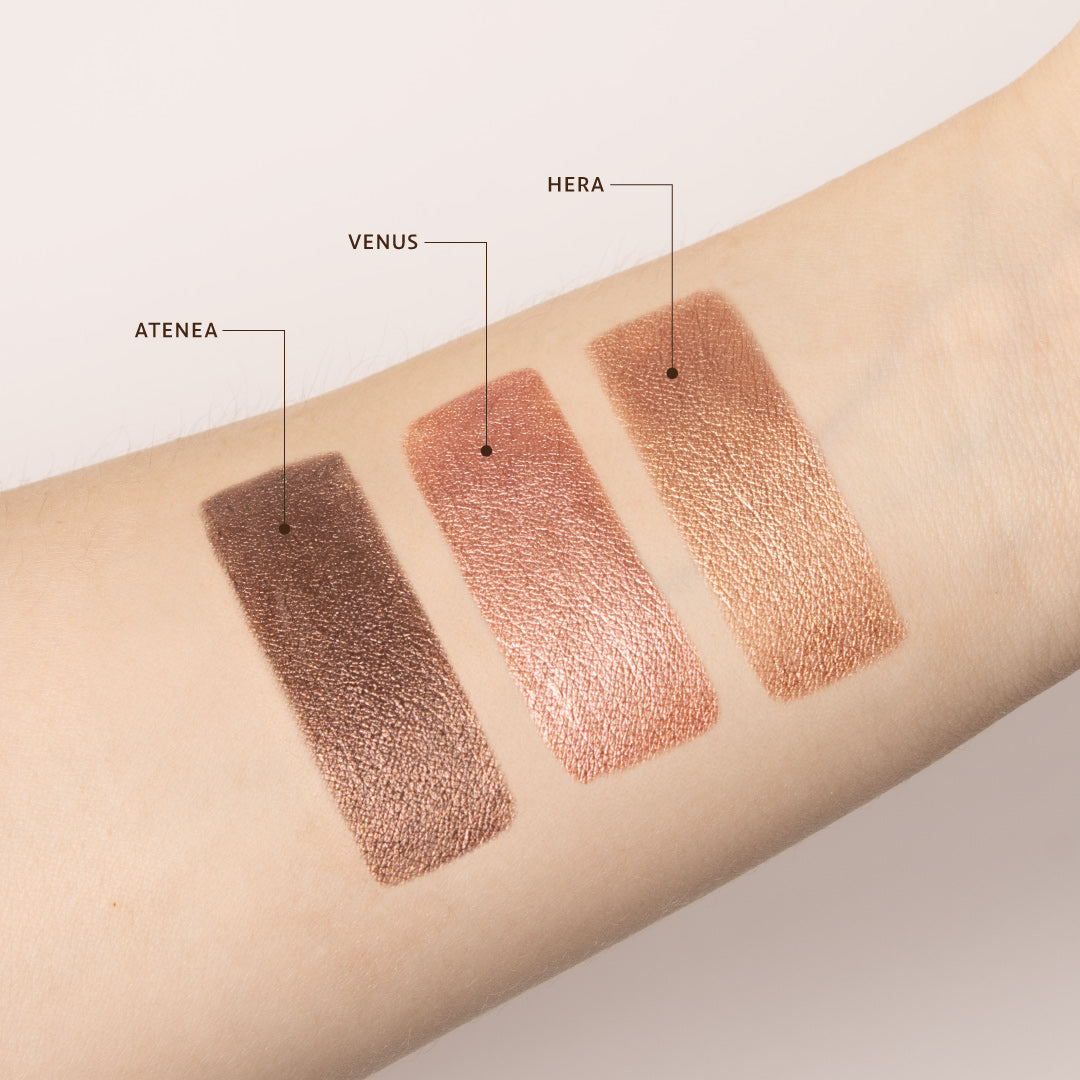 Venus y Atenea: INGREDIENTS: AQUA, GLYCERIN, MICA, PROPANEDIOL, CI 77891, CI 77491, GLYCERYL STEARATE CITRATE, POLYGLYCERYL-3 STEARATE, CI 77499, SIMMONDSIA CHINENSIS SEED OIL, SODIUM CHLORIDE, PRUNUS ARMENIACA KERNEL OIL, GLYCERYL CAPRYLATE, HYDROGENATED LECITHIN, XANTHAN GUM, ACACIA SENEGAL GUM, CAPRYLHYDROXAMIC ACID, TIN OXIDE, SODIUM PHYTATE, SODIUM BICARBONATE, TOCOPHEROL, ALCOHOL.