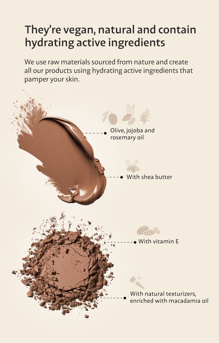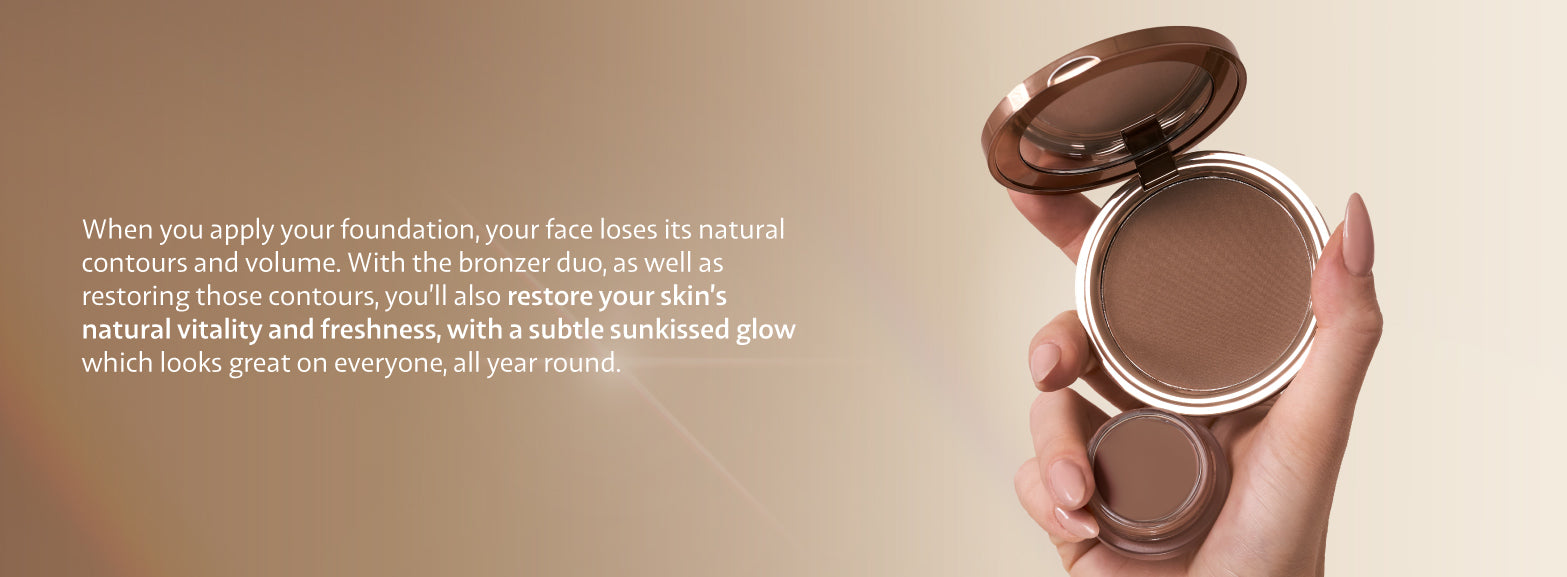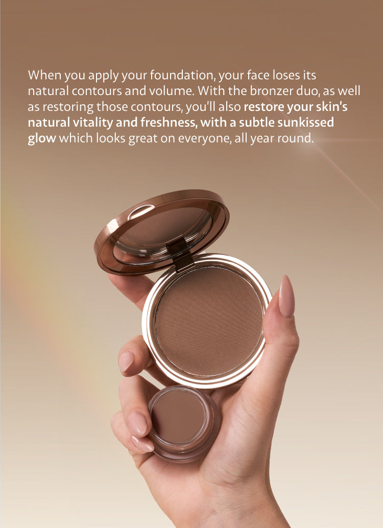 Su fórmula en crema junto a la textura en polvo ultrasedosa y de larga duración brinda un bronceado impecable que se funde en la piel. Juntos recrean ese tono cálido tan favorecedor que aparece después de un día al sol.