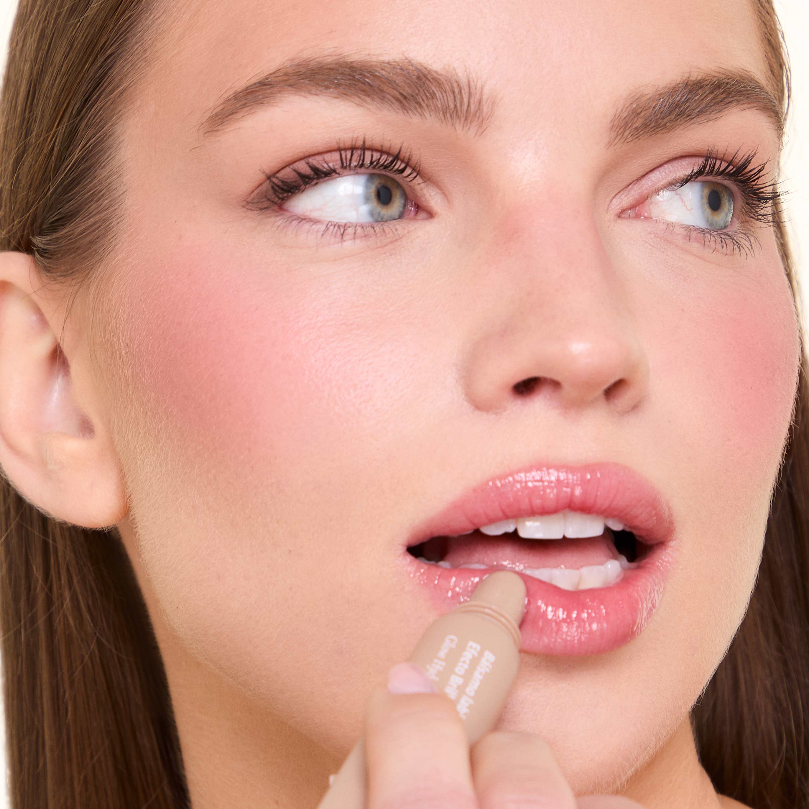 Luego aplica el colorete en los labios a toquecitos con los dedos para un acabado suave o aplica más producto para un labio más cubierto.