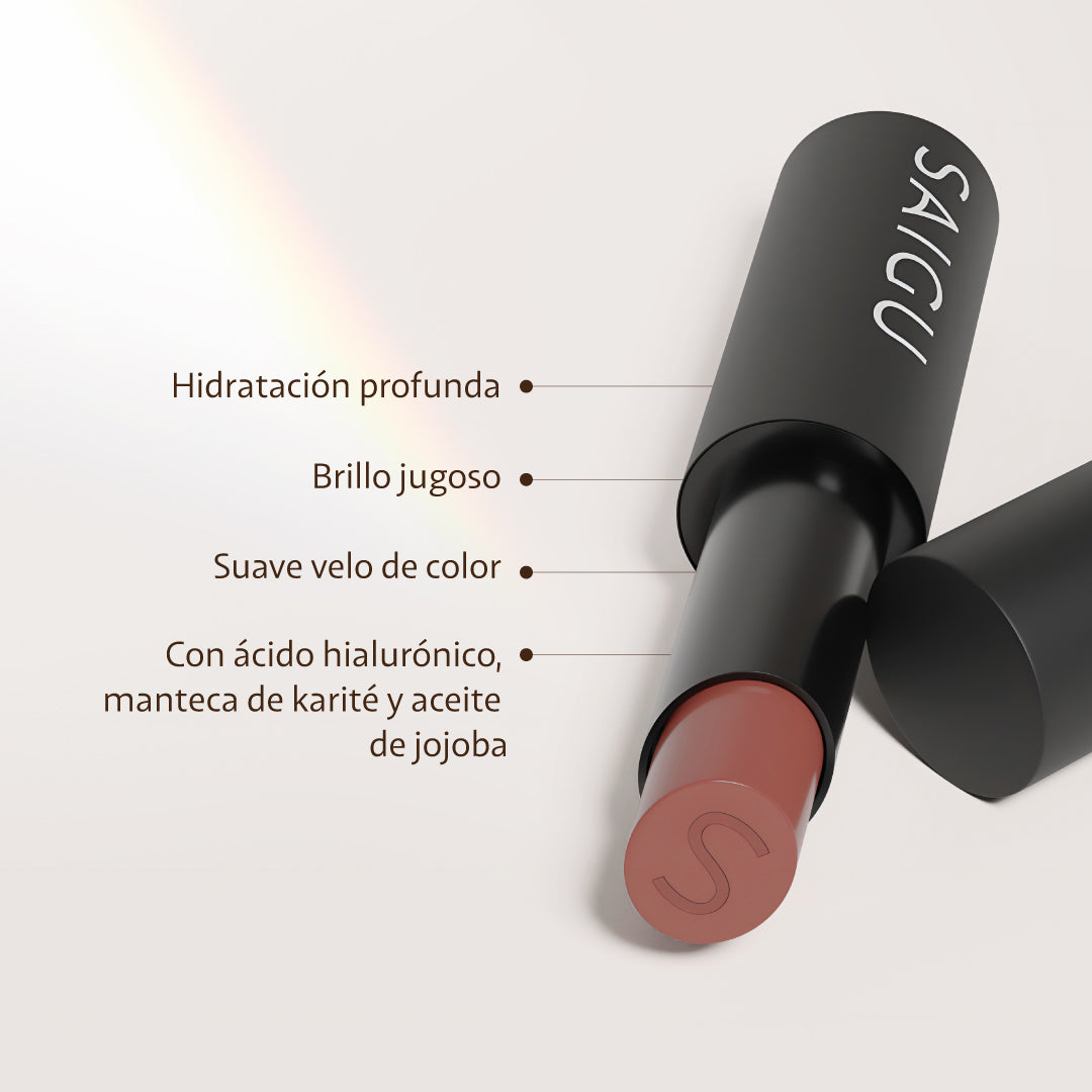 Es tan ligero que casi no notarás que lo llevas, pero deja un brillo jugoso que ilumina el rostro al instante. Y lo mejor, hidrata y cuida tus labios con aceite de jojoba, manteca de karité y ácido hialurónico de diferentes pesos moleculares.