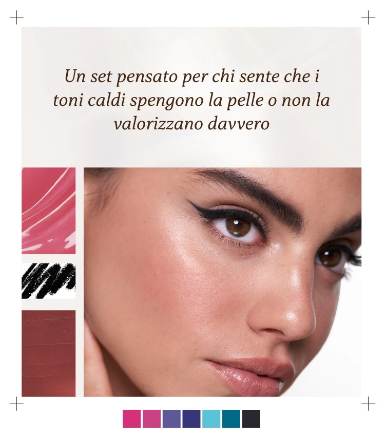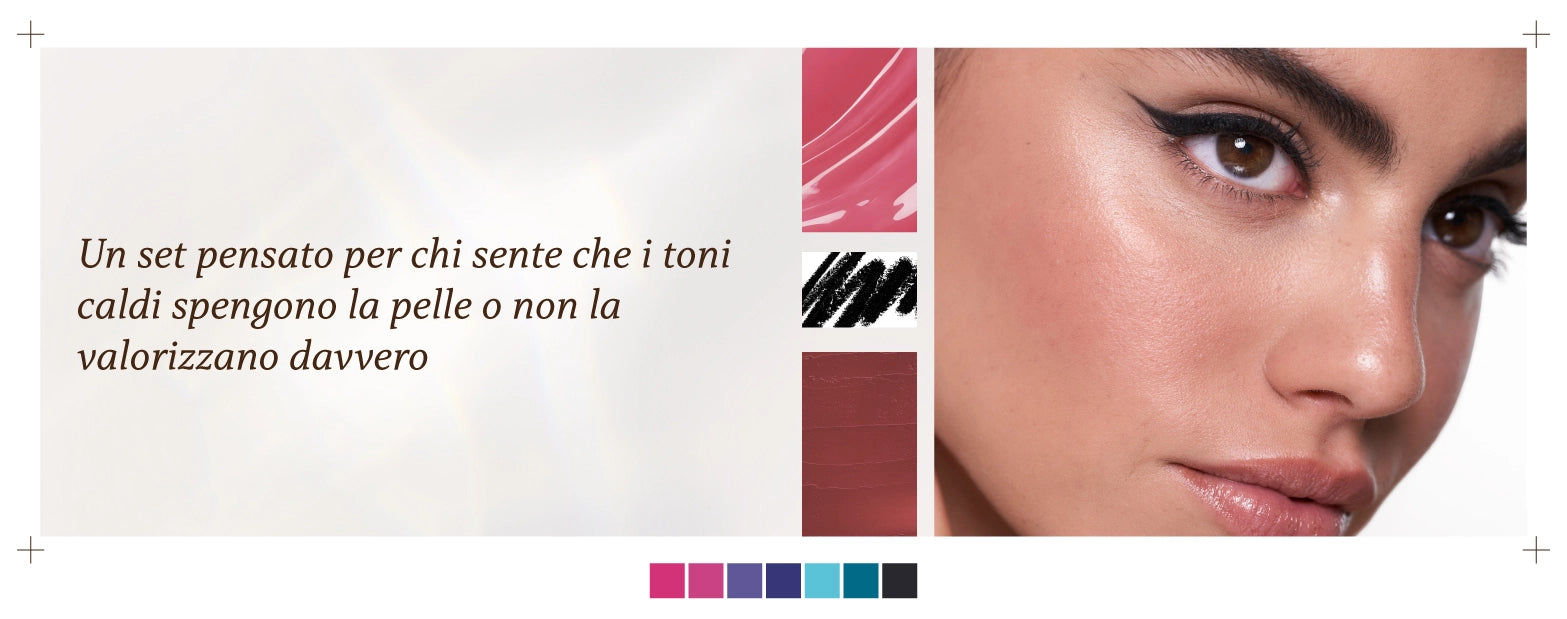 Este pack reúne un colorete en crema, un labial y un lápiz de ojos pensados para armonizar entre sí y con pieles que funcionan mejor con matices fríos e intensos.