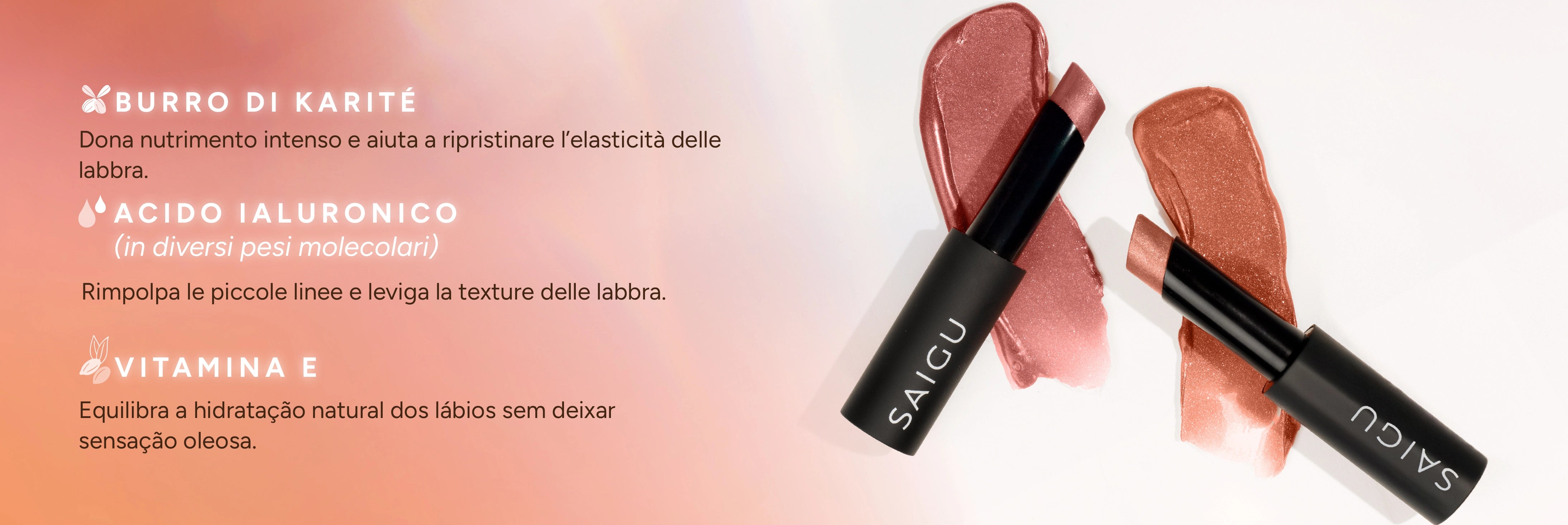 Estos tonos no buscan cubrir el labio, sino iluminarlo con un toque de color traslúcido que se funde con el tono natural del labio. Al estar formulado con aceite de jojoba, manteca de karité y ácido hialurónico funciona como un bálsamo que hidrata durante todo el día.
