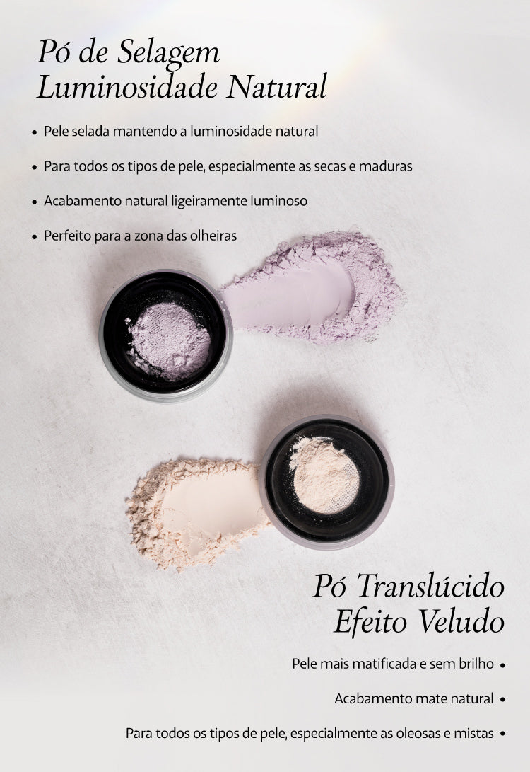 Os pós de fixação mantêm a luminosidade natural da pele e são perfeitos se não gostas do efeito totalmente mate. Foram pensados para peles secas ou sensíveis e para quem prefere um look mais hidratado e fresco.