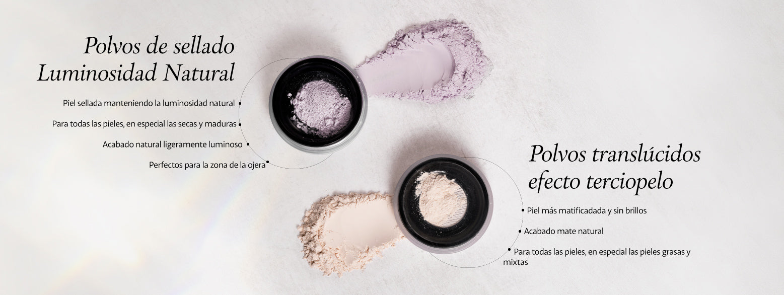 Aunque ambos polvos son muy ligeros, la diferencia está en el acabado que buscas. Los polvos de sellado mantienen la luminosidad natural de la piel y son perfectos si no te gusta el efecto mate. Están pensados para pieles secas o sensibles y para quienes prefieren un look más hidratado y fresco. Los polvos efecto terciopelo son ideales si prefieres una piel más matificada, sin brillos y con un efecto suavizante en la textura.