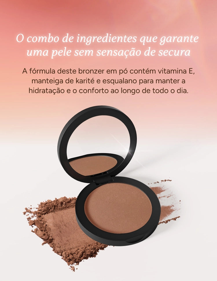 En absoluto. Este bronzer se adhiere a tu piel como una segunda capa, sin dejar rastro de polvillo ni sensación seca. Lo único que notarás es un acabado suave y natural.