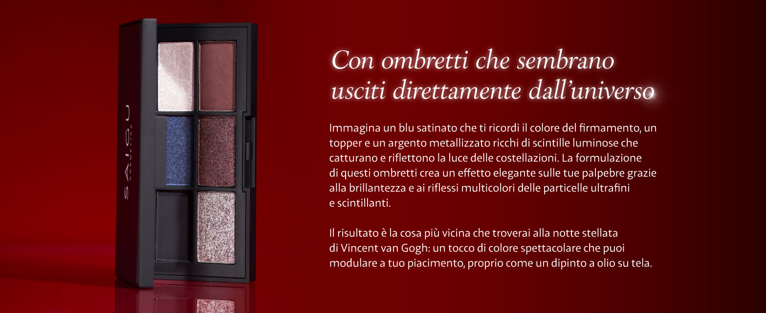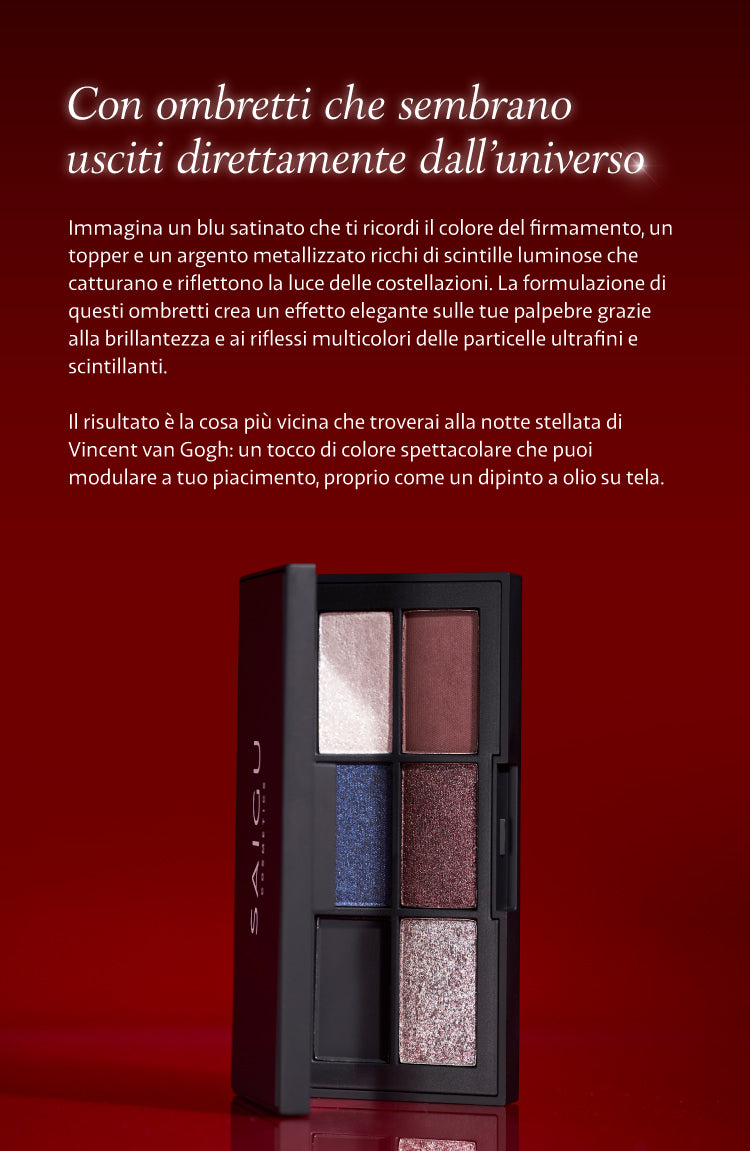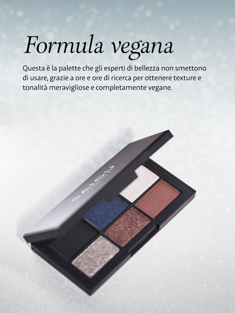 Una palette di 6 tonalità raffinate che ti trasporta in un universo di colori vibranti e texture uniche, sospese tra realtà e fantasia. All'interno troverai un blu notte satinato, profondo e misterioso, un argento luminoso, un top coat dall'effetto bagnato celeste, e tonalità calde di marrone e nero intenso per creare contrasti e profondità. Scegli tu se preferisci un look delicato con un tocco di top coat sulla palpebra e un tocco di marrone nella piega dell'occhio, oppure un look più audace con un intenso blu notte che cattura tutti gli sguardi.