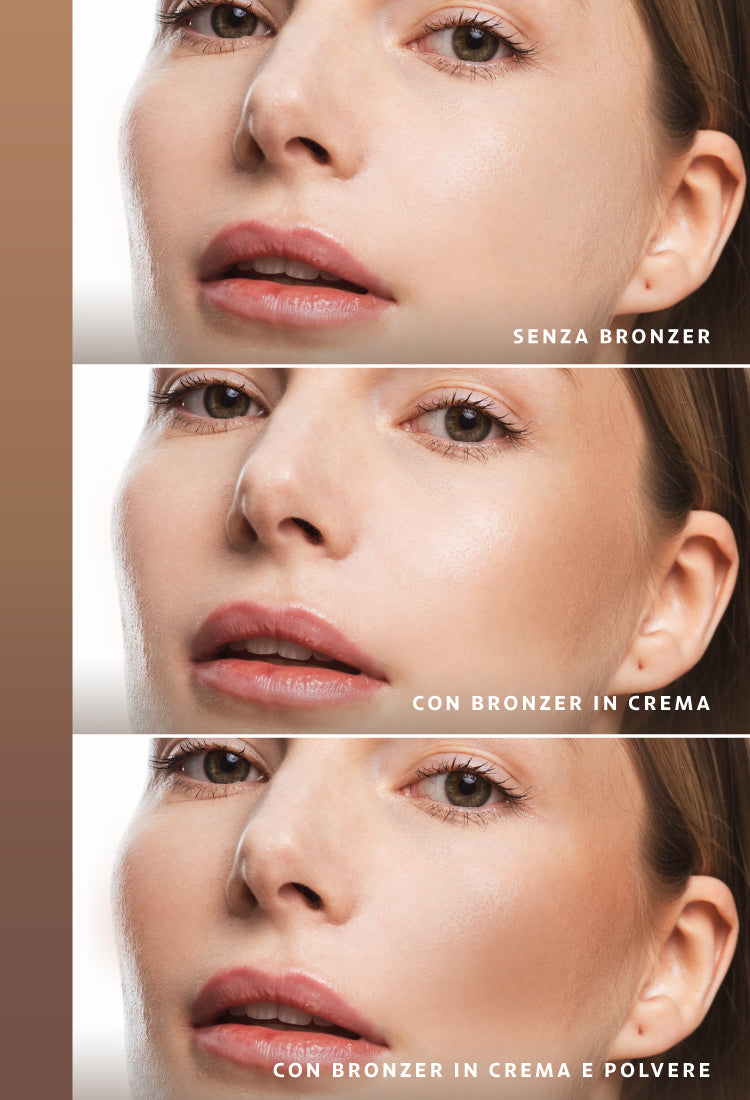 Se finisci con il bronzer in polvere ti servirà per fissare la pelle e il finish sarà leggermente più opaco. Se concludi il tuo trucco con il bronzer in crema il risultato sarà leggermente più luminoso.