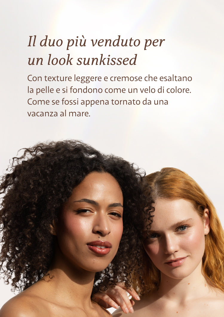 Un rossore naturale che cattura le tonalità dopo una giornata al sole, e un bronzer che si fonde con la tua pelle per un finish caldo e luminoso.