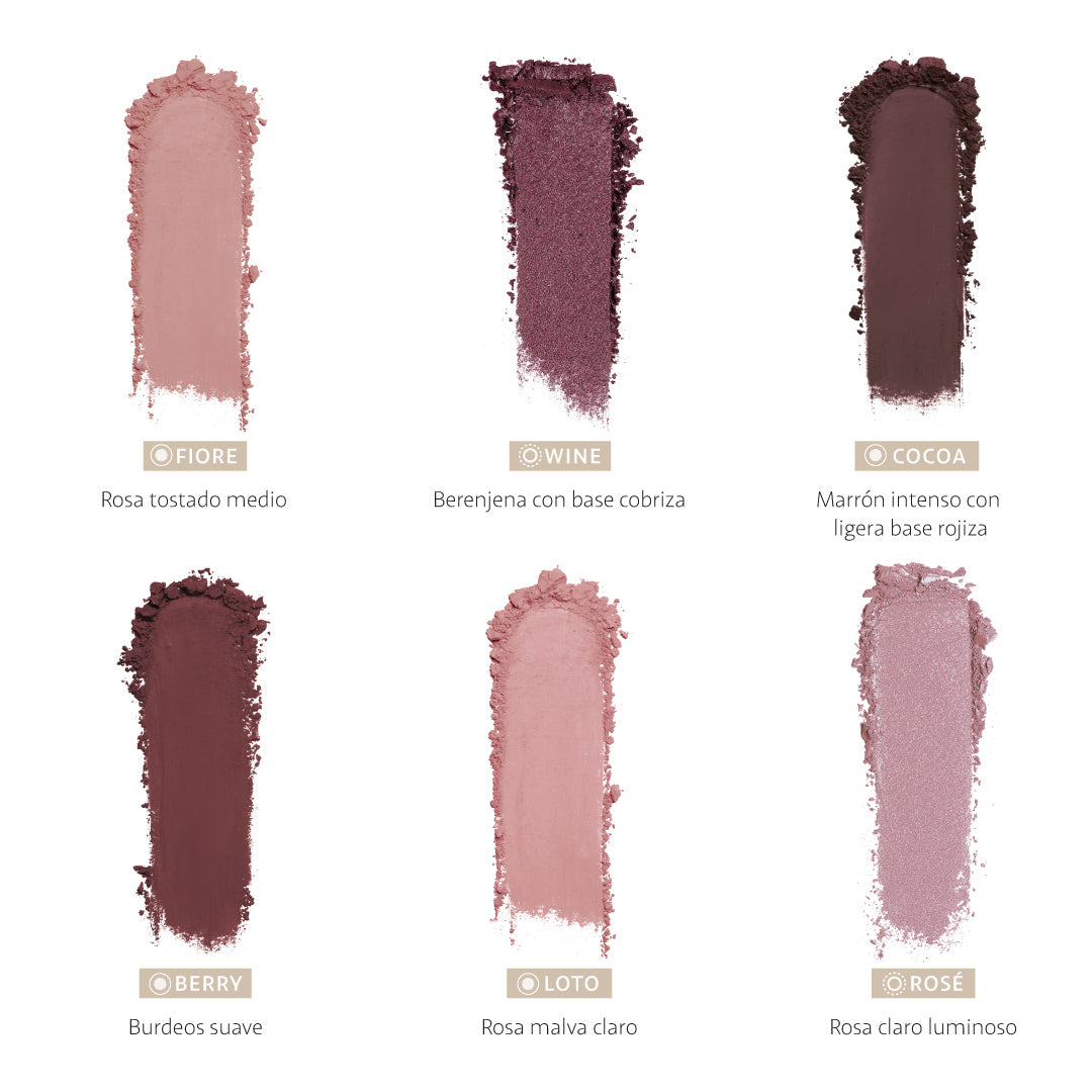 Ha tutte le tonalità romantiche di cui hai bisogno per lanciarti nell'avventura di giocare con loro a tuo piacimento. Rosa, bordeaux, crema, shimmer... Una palette per tutti i giorni o per eventi unici in cui si desidera un make-up più speciale.
