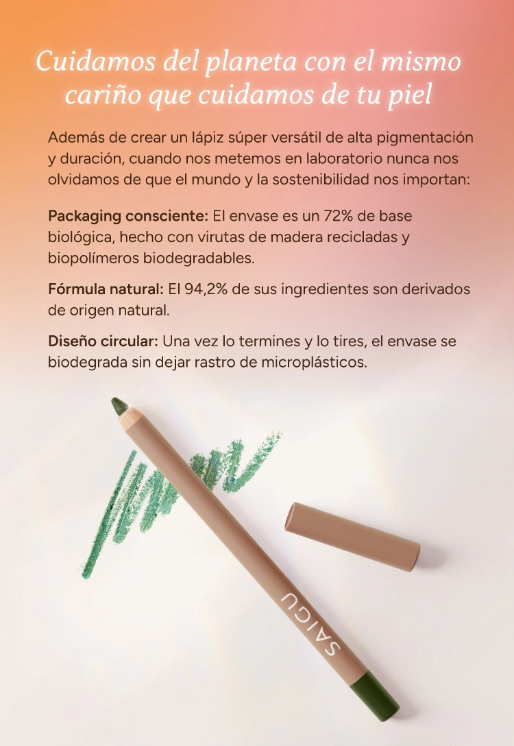 Combina cremosidad, alta pigmentación y larga duración en un tono verde cálido metalizado inspirado en la luz del verano mediterráneo, como ese momento en el que el sol se refleja en las hojas y aprecias todos sus matices. Su textura cremosa se desliza con suavidad sobre el párpado, sin irritar.