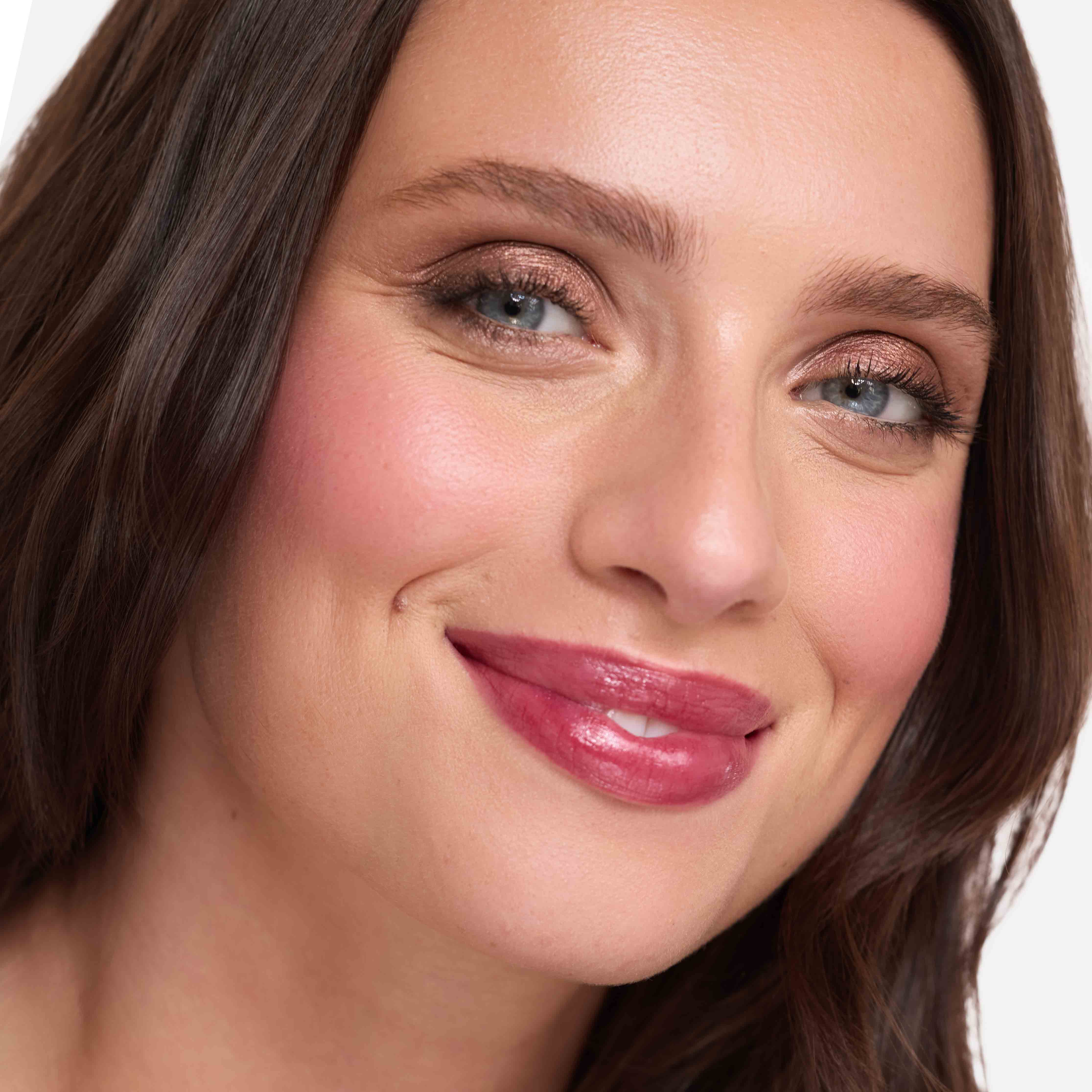 A tendência Cherry Glam ganha um toque sofisticado com pálpebras em tons bronze cintilante, maçãs do rosto com um rubor cereja suave e lábios luminosos com efeito de fruta fresca acabada de morder.