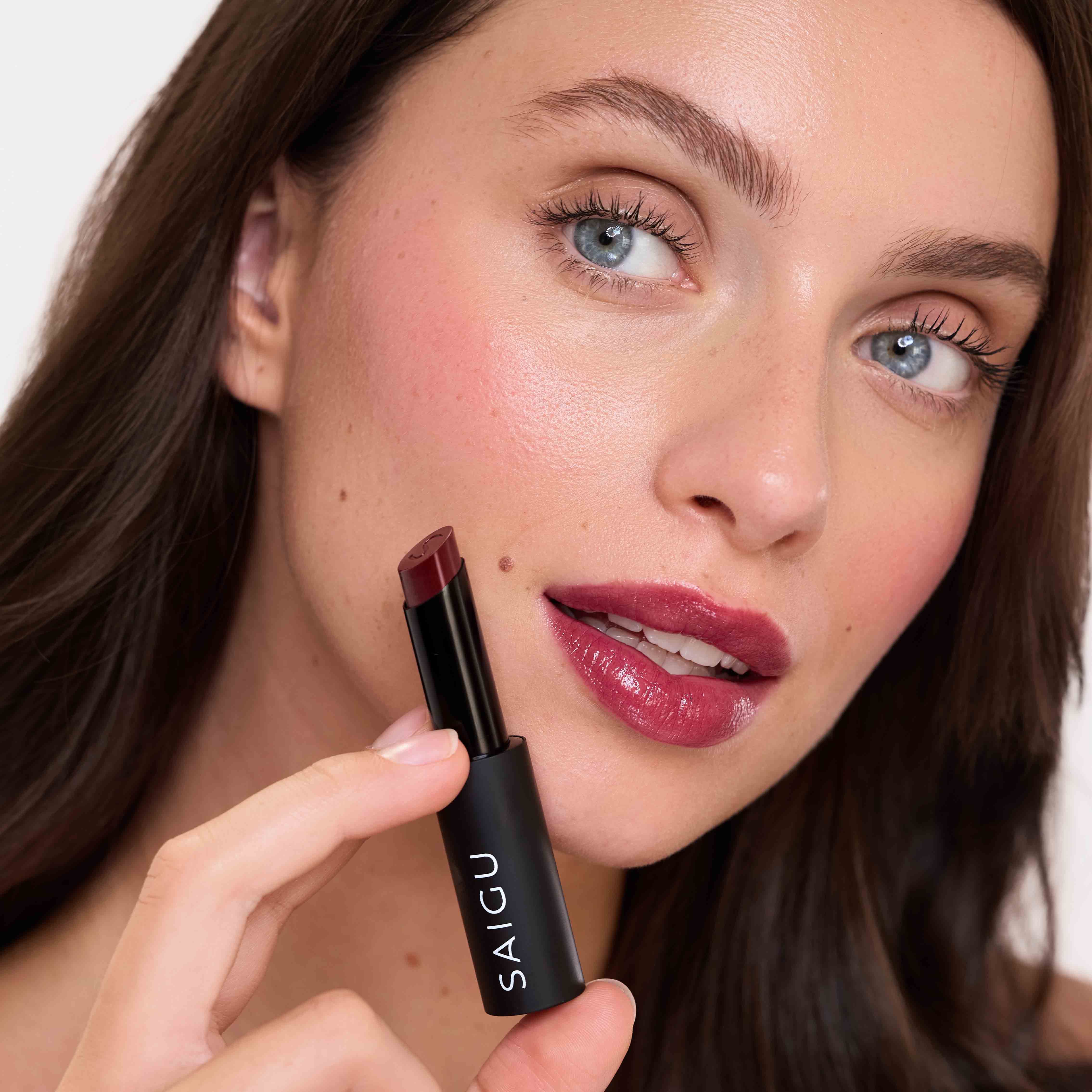 Se tivéssemos de descrever este batom, diríamos algo assim: o tom de uma ameixa madura e profundo, mas sem chegar a ser escuro. Ou o reflexo suave de um copo de vinho tinto contra a luz. Tem uma base quente, entre o castanho-avermelhado e o ameixa, que envolve os lábios e realça a sua cor com uma elegância discreta.