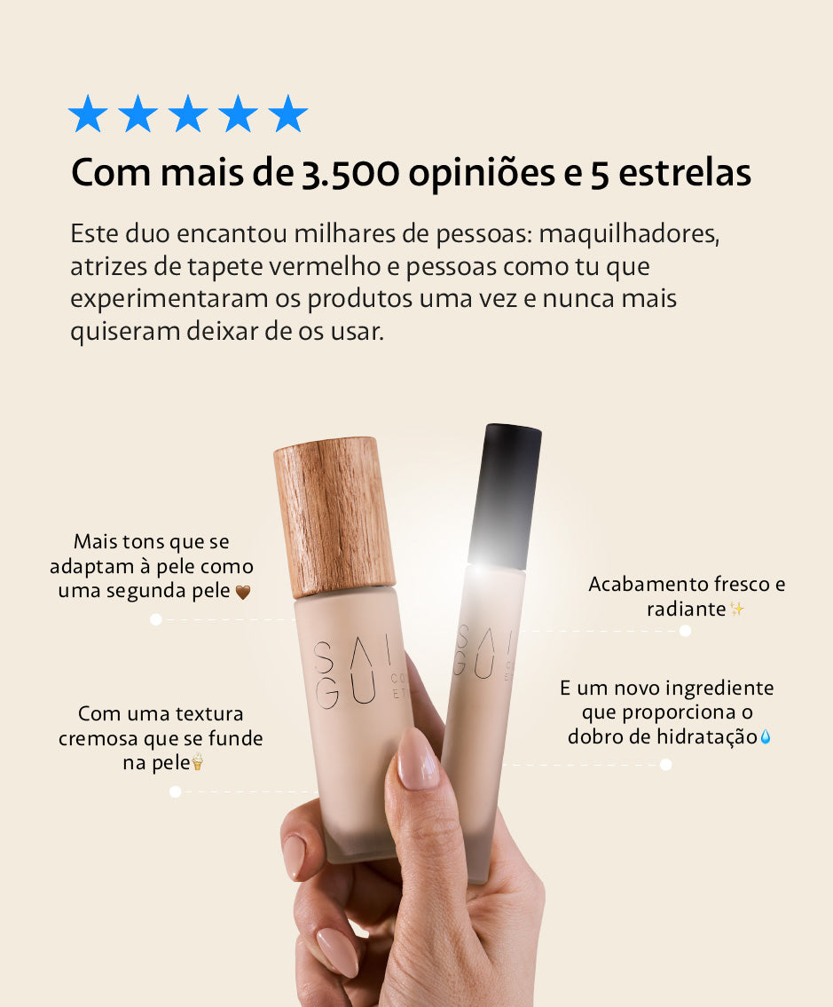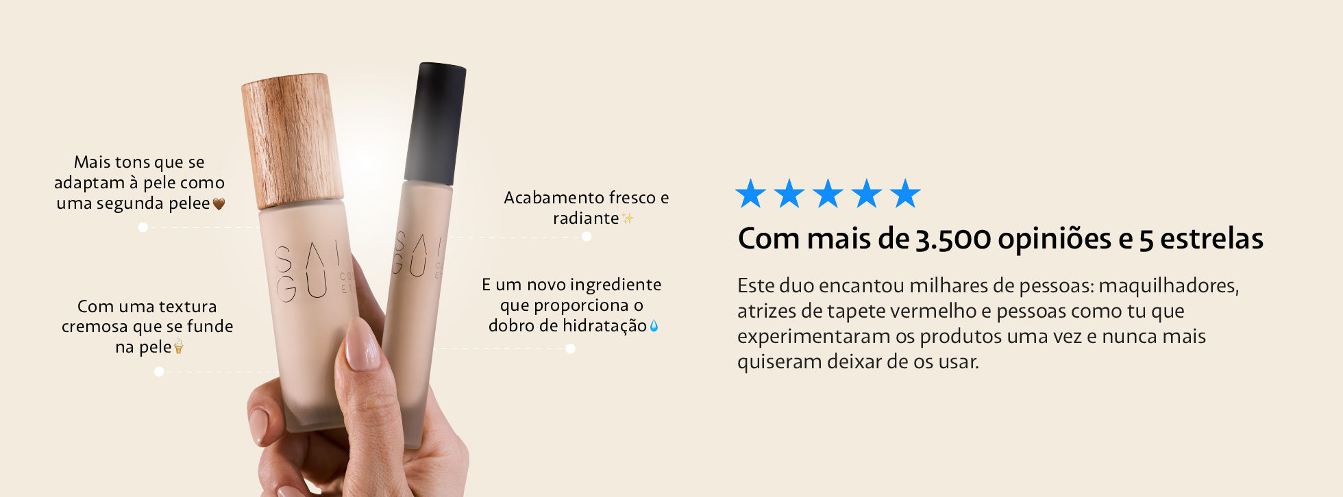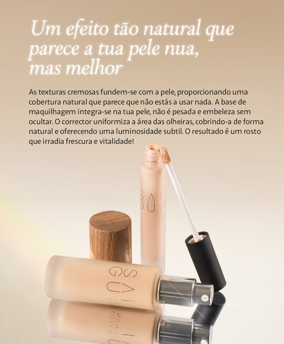 Encontrar o teu tom pode causar algum receio se nunca compraste maquilhagem online, mas na Saigu damos muitas facilidades: temos um teste de 2 minutos que te sugere o tom de base outro teste para o tom de corretor. uma equipa de apoio ao cliente que adivinha a tua cor com apenas uma foto, e trocas e devoluções gratuitas durante 15 dias.