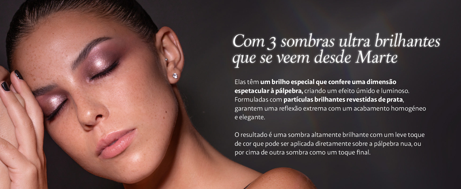 As sombras metálicas têm uma base de cor uniforme e cobrente, com um brilho metálico que dá um acabamento satinada, delicado e subtil. Já as sombras ultra brilhantes têm uma base de cor semi translúcida com reflexos ultra brilhantes que proporcionam um acabamento glamoroso e sofisticado.